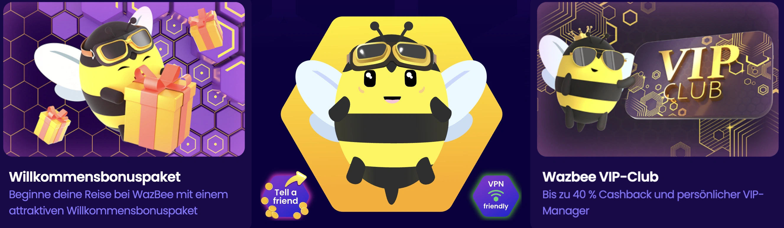 Wir belohnen jeden Spieler für seine Treue. Als treuer Wazbee-Spieler sammelst du Punkte, Cashbacks und Bonusangebote bei Events. Jeder beginnt als Tiny Bee, aber der Aufstieg ist möglich – bis hin zum Queen Bee-Status in unserem exklusiven VIP-Club.